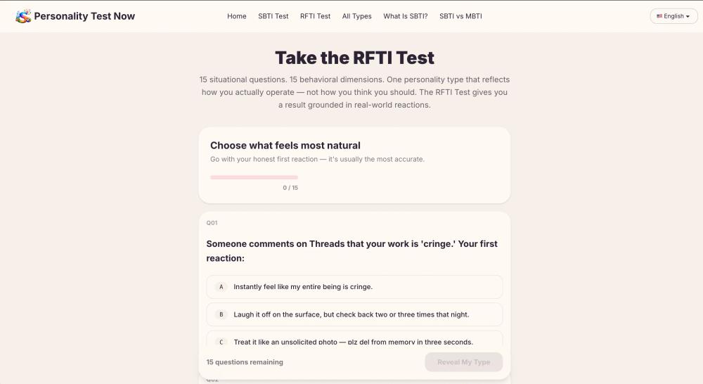 Instead of asking vague psychology stuff, RFTI Test gives you 15 scenario-based questions and uses your choices to map your behavior style across multiple dimensions. The whole thing is fast, easy to take, and surprisingly relatable.